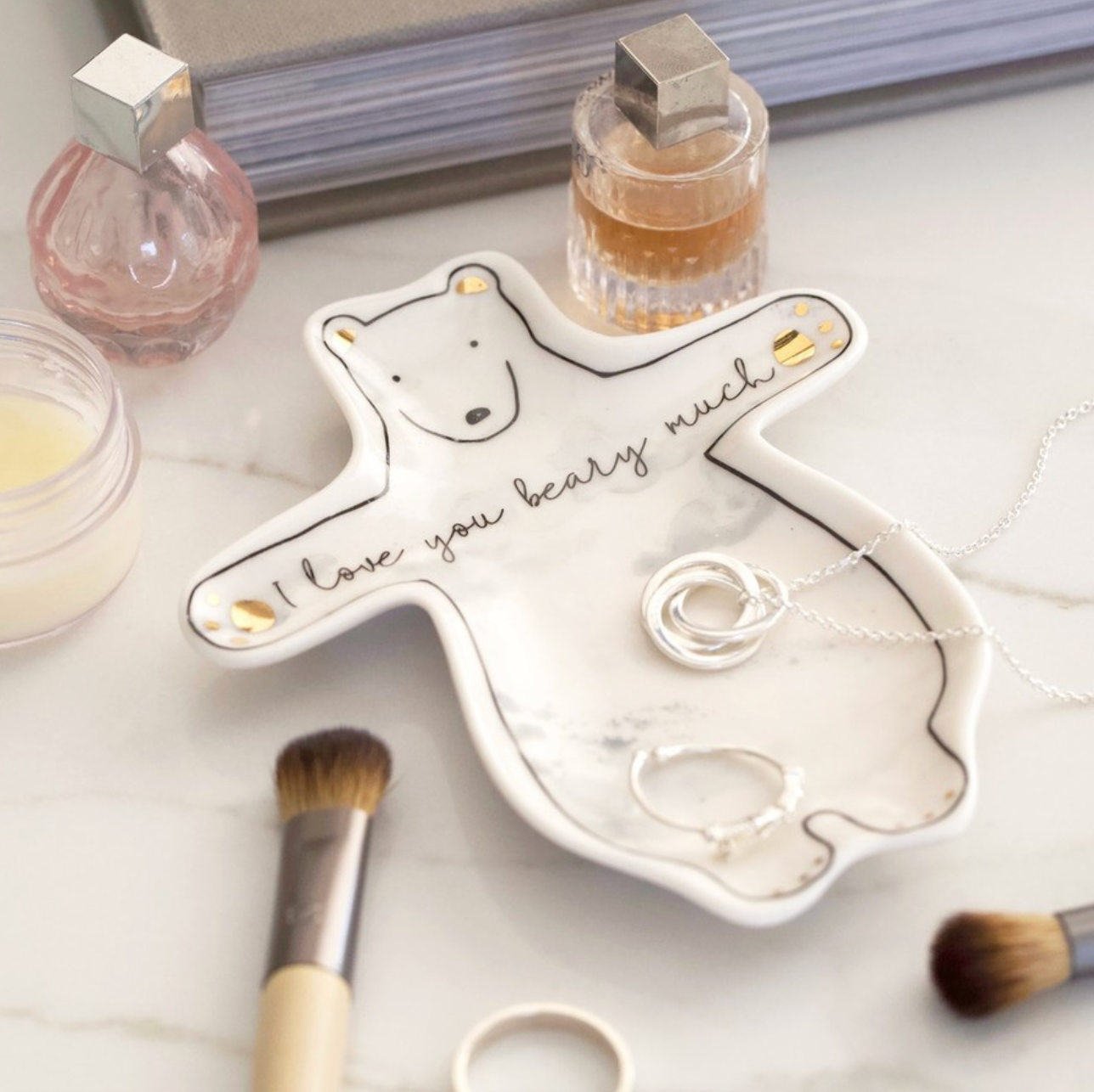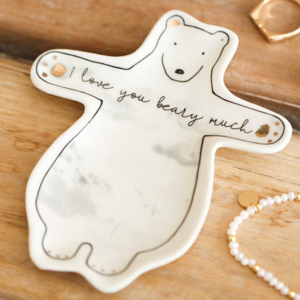 Shaped like a bear with arms outstretched, this flat dish has pretty gold foil details on the paws and ears, and comes complete with a heartwarming quote reading 'I love you beary much'.