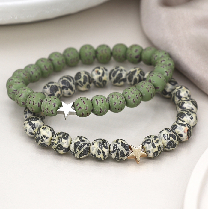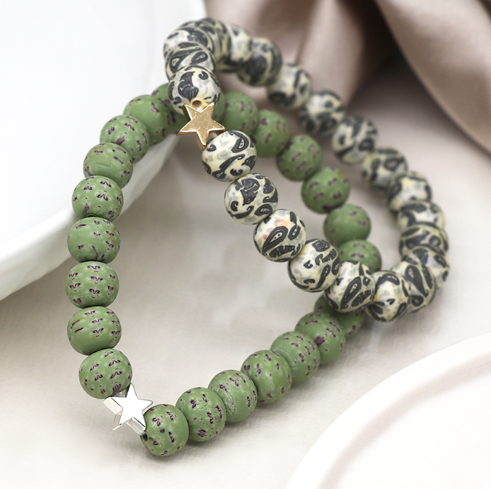Double bracelet set with round matt patterned beads in khaki green, mixed grey and white, featuring golden and silver plated star beads!