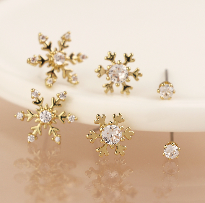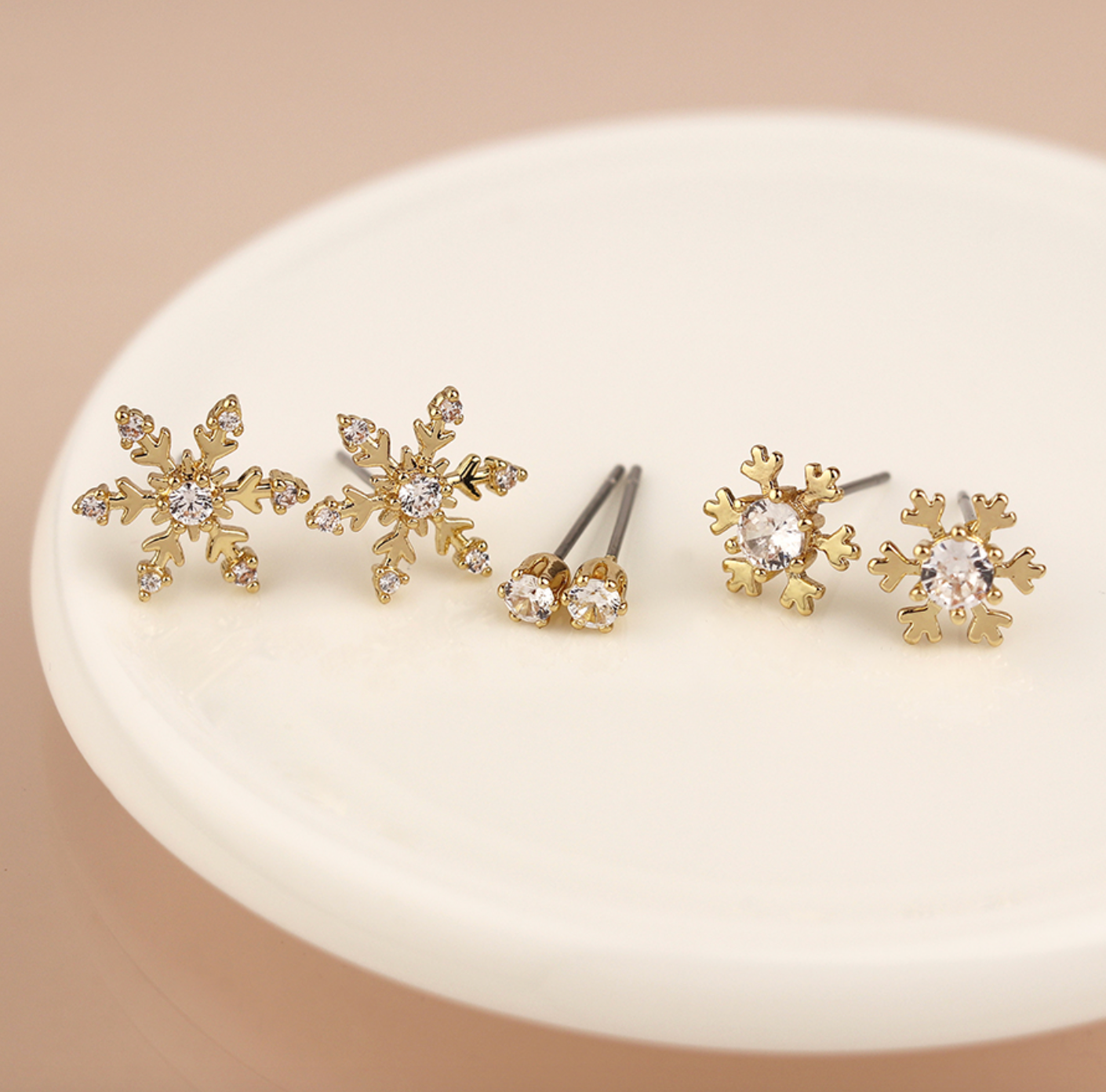Faux gold plated triple stud earring set with two pairs of crystal snowflakes and one classic crystal pair!