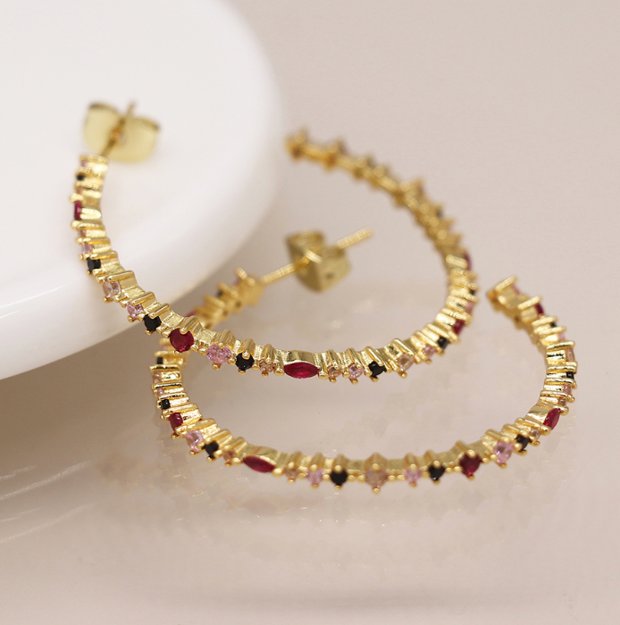 Faux gold plated elegant hoop earrings with fine mixed shape crystals in deep red, black, pink and clear