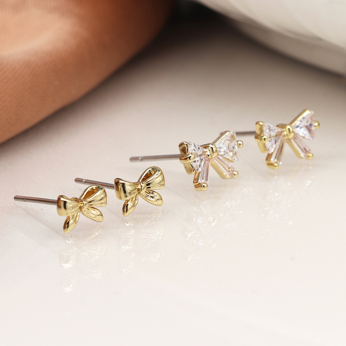 Faux gold plated double earring set with two pair of bow studs, one pair with a polished golden finish and one inset with crystals.